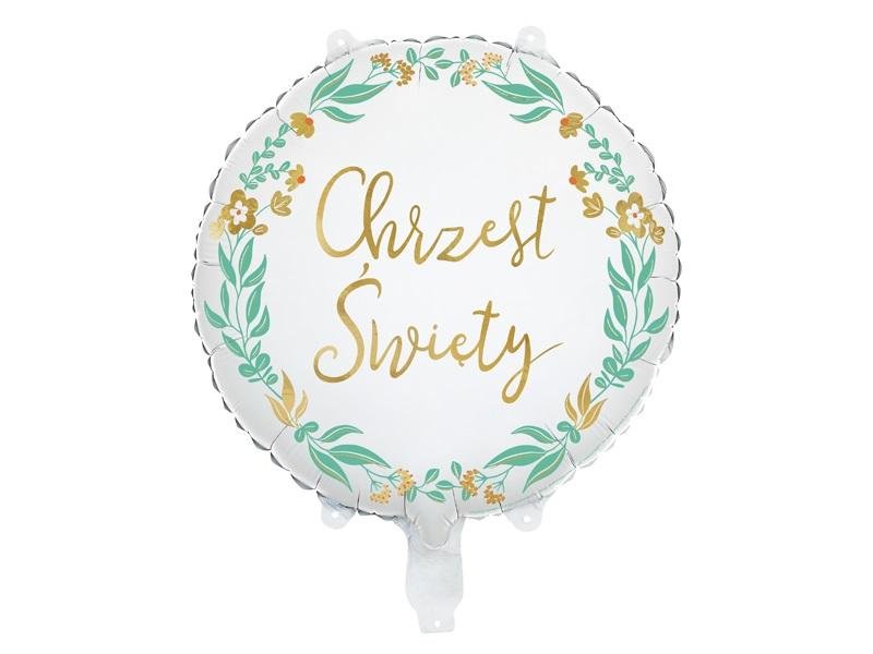 Balon foliowy w kolorze białym z kolorowym nadrukiem i napisem ''Chrzest Święty'' w kolorze złotym, wymiary przed napompowaniem ok. 45 cm (18''), wymiary po napompowaniu ok. 35 cm (14''). Do napompowania powietrzem i helem. Zestaw zawiera słomkę. prečítať celé