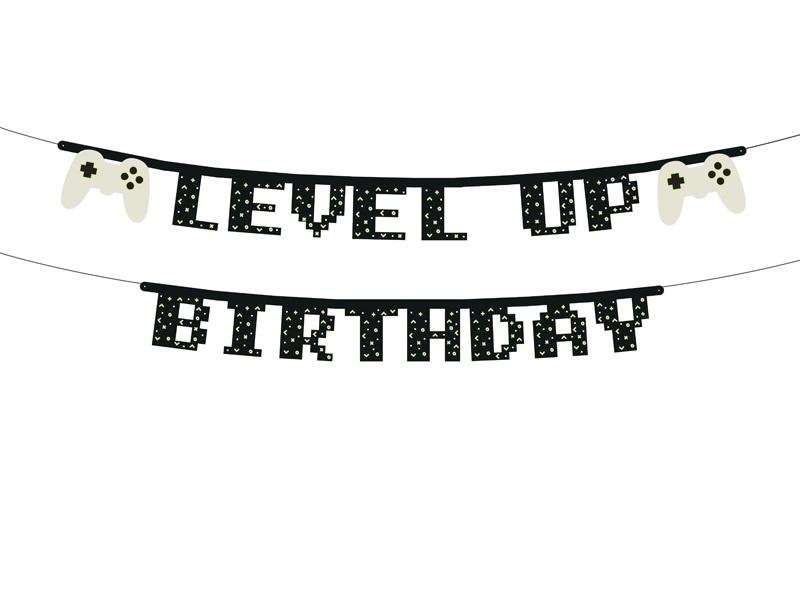 Baner z napisem ''Level up Brithday'' w kolorze czarnym z kolorowym nadrukiem zawiera ok. 17 nitów, wysokość ok. 13 cm, długość baneru ok. 2.5 m. Produkt do samodzielnego złożenia. prečítať celé