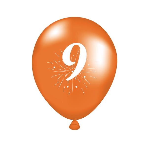 Party balónky s potiskem číslice "9" jsou vhodné na oslavu narozenin či různých výročí. Balení obsahuje 5 ks balónků (2x oranžový, 2x zelený, 1x žlutý o rozměru cca 25 cm (po nafouknutí). Balónky nafukujte pouze do přiměřeného rozměru. Manipulace dětí s balónky by měla probíhat pouze pod dozorem dospělé osoby. Skladujte při teplotách nad 10°C. Vyrobeno z přírodního latexu.