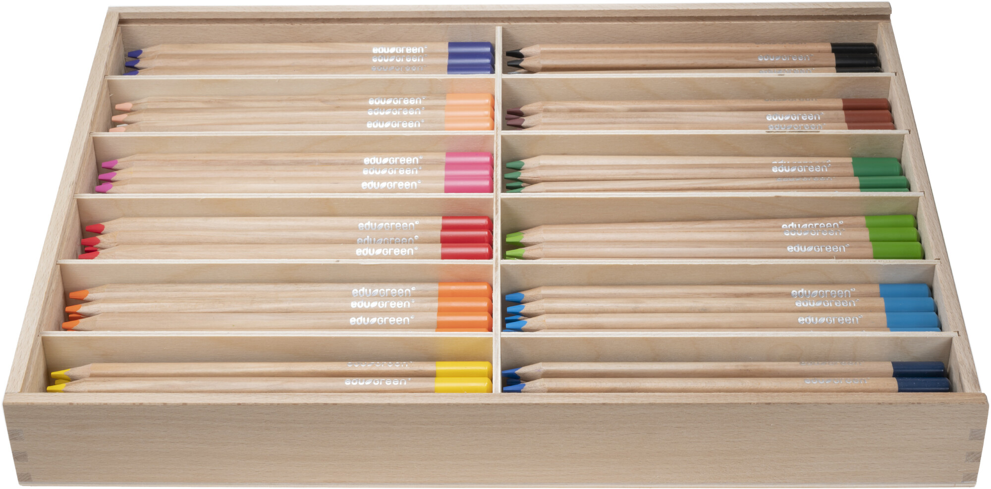 Obsahuje: 144 kusů barevných trojhranných pastelek balených v praktické dřevěné krabičce (12 různých barev, průměr tuhy 5 mm)