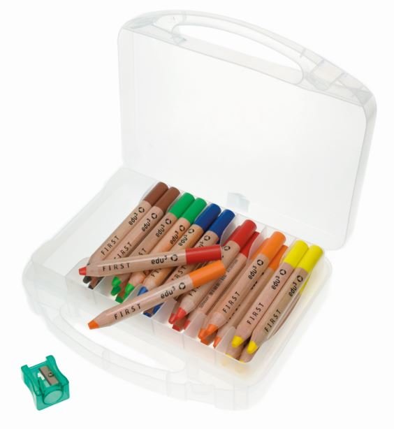 EDU3 First extra měkké kulaté pastelky ve dřevě, tuha 8 mm, P36S 36ks/6 barev + 3 ořezávátka v plastovém kufříku