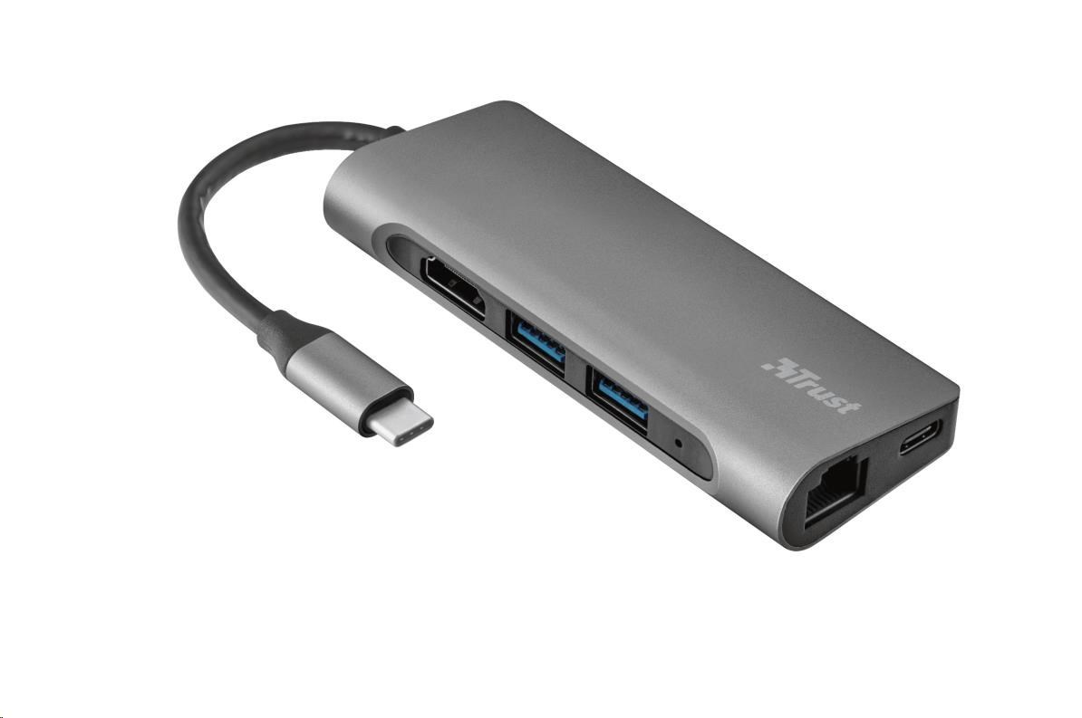 Stylish aluminium USB-C multi-port adapter to add HDMI, network, card reader, USB-C and USB-A ports to your laptop using a single USB-C connection