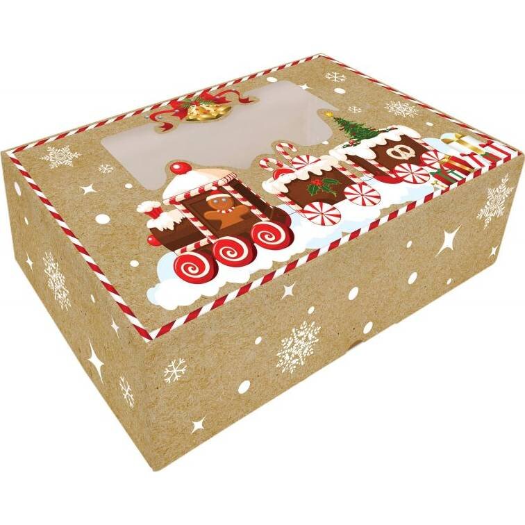 Krabička na vánoční cukroví či výslužku skládací, s průhledným okénkem - motiv vánoční vláček. Rozměry 36x22x5 cm. prečítať celé