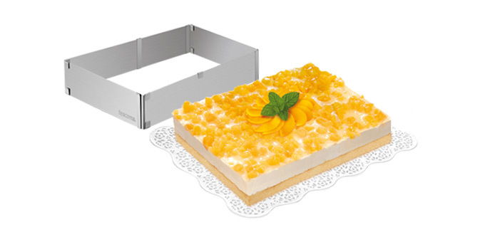 Nastavitelná forma na obdélníkové dorty o libovolné velikosti od 28x20 cm do 50x34 cm. S přepážkou pro přípravu dvou různých dortů současně. Formu roztáhněte na požadovanou velikost a přepážku zasuňte do kovových objímek, používejte hustší, méně tekuté těsto. Vyrobeno z prvotřídní nerezavějící oceli, vhodné do elektrické, plynové i horkovzdušné trouby, vhodné do myčky. 3 roky záruka.