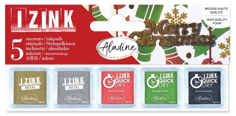 Sada 5 razítkovacích polštářků: 3x rychleschnoucí inkousty (zelená, červená a černá) a 2 metalické inkousty (zlatá a stříbrná). Velikost polštářků 3,3 x 3,3 cm. Ideální na výrobu vánočních přání, drobných dárků, visaček, dárkových tašek, krabiček, papírů, vánočních ozdob. Metalické barvy nechte zaschnout 4-6 hodin. Nemetalické (červená, zelená, černá) schnou velmi rychle, jsou voděodolné.
