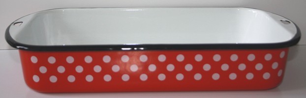 Hranatý smaltovaný pekáč v červeném provedení s bílými puntíky na vnější straně, bílý na vnitřní straně. Lze mýt v myčce nádobí. Materiál - smalt. Rozměry - délka 30 cm, šířka 18 cm, výška 6 cm. prečítať celé