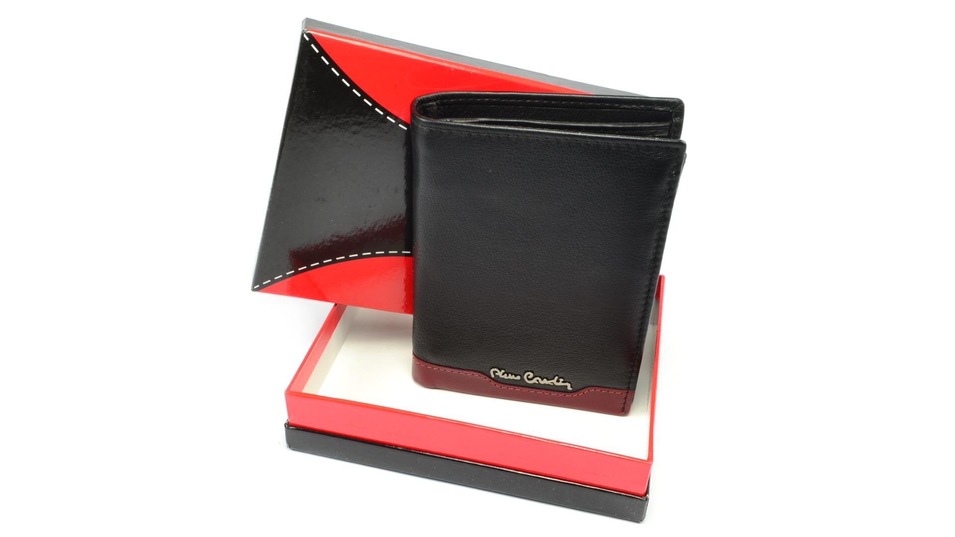 Pánská peněženka kožená s parádním červeným proužkem na spodní straně. Po otevření peněženky jsou přístupné kapsy na karty, mincovník a kapsy na bankovky. Otevřením další přezky s drukem je přístupná další část peněženky, ve které jsou průhledné kapsy na doklady a kapsy na karty. Peněženka je vyrobená z pravé kůže černé barvy a je značky Pierre Cardin.