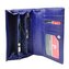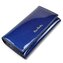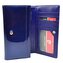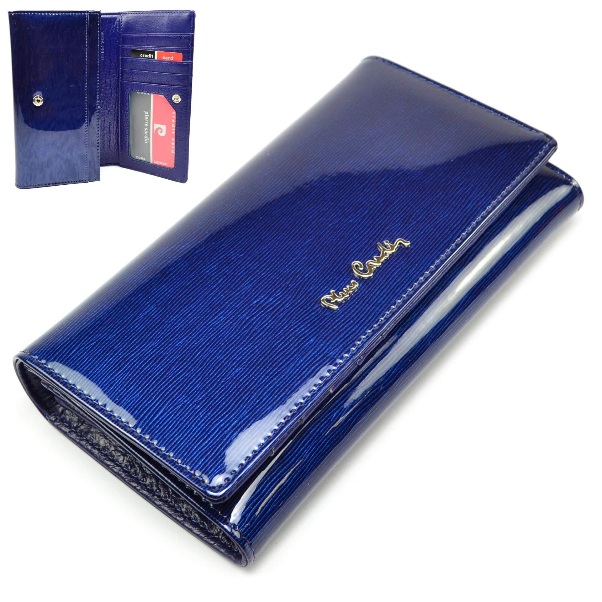 Velká kožená peněženka dámská luxusně zpracovaná s propracovanými detaily. Peněženka se uzavírá klopou s pevným drukem. Po otevření dámské peněženky se lehce dostanete ke všem kapsám na karty, bankovky a mincovníkům. Mincovníky má peněženka dva a zavírájí se zipem. Velká kožená peněženka dámská je z pravé kůže modré barvy, na povrchu je foliovaná pro lepší stálost barev. Peněženka je značky Pierre Cardin.