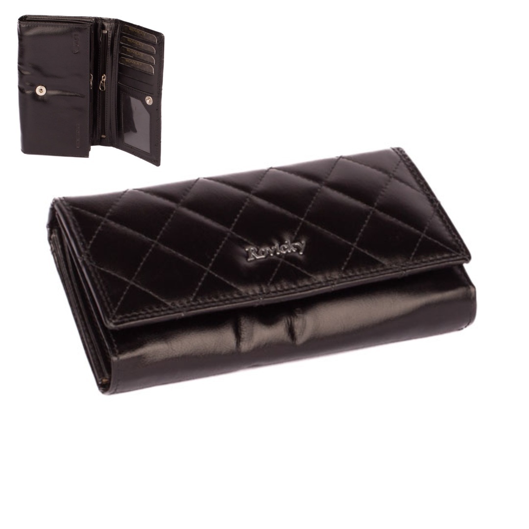 Dámská velká peněženka černá je vyrobena z pravé kůže se světlým prošíváním. Po otevření peněženky jsou přístupné kapsy na platební karty, jedna z nich je průhledná. V peněžence jsou kapsy na bankovky a další kapsa na zip, kterou lze využít jako mincovník. Dámská velká peněženka černá je vyrobená z pravé kůže a je značky Rovicky. Peněženka je dodávána v dárkové krabičce.