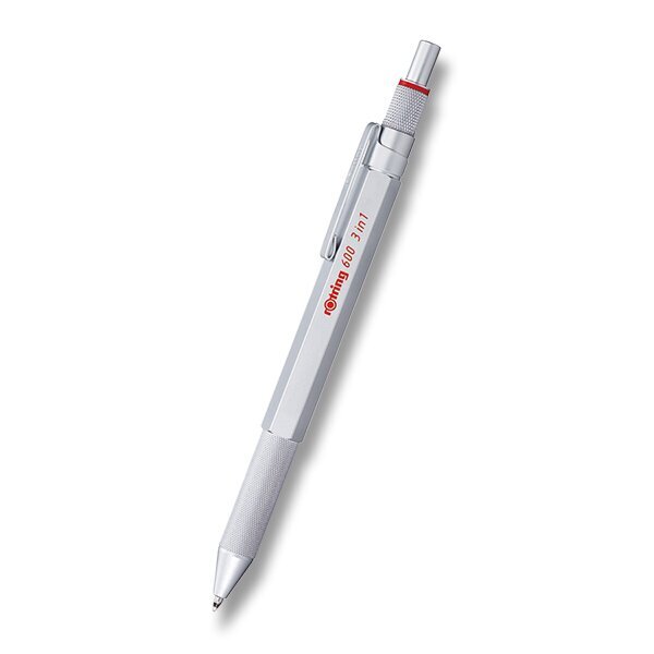 Kuličkové pero Multipen Rotring 600 Silver 3 v 1 má celokovové šestiboké tělo s protiskluzovou rýhovanou úchopovou částí a matně lakované mosazné tělo v kombinaci s doplňky v dané barvě. Kuličkové pero má 2 barvy (červená, černá) a mechanickou tužku 0,5 mm v 1 Multipenu. Modrá náplň je součástí balení.