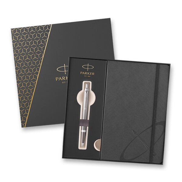 Souprava obsahuje zápisník v šedé barvě a kuličkové pero Parker IM Writing Rituals Grey s mosazným tělem pokrytým saténově metalickým barevným lakem v kombinaci s doplňky pokovenými chromem.