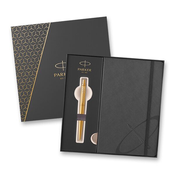 Dárková kazeta kuličkového pera Parker Jotter XL Monochrome Gold GT se zápisníkem. Pero má zlatě lakované tělo a zlatě lakovaná vrchní část z nerezové oceli. V kombinaci s doplňky potaženými pomocí techniky PVD odolnou matně zlatou vrstvou. prečítať celé