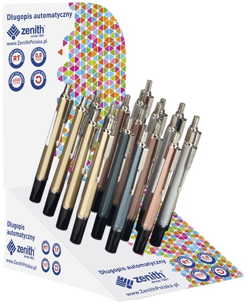• długopis automatyczny z niklowanymi elementami• korpus wykonany z błyszczącego tworzywa sztucznego • obudowa dzielona w 1/3 wysokości (górna część ośmiokątna), obie części korpusu oddzielone mosiężno-niklowaną obrączką• charakterystyczny wielopłaszczyznowy klips wykonany z materiału...