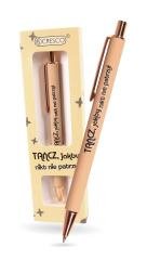 Długopis automatyczny z wymiennym wkładem 1mm. Kobieca kolorystyka, softowy, pastelowy korpus ze wykończeniami w odcieniach różowego złota. Nadruk na długopisie i pudełeczku to Tańcz, jakby nikt nie patrzył. Dodatkowo wzbogacony nadruk o wyjątkową grafikę. Długopis zapakowany w prezentowe etui...