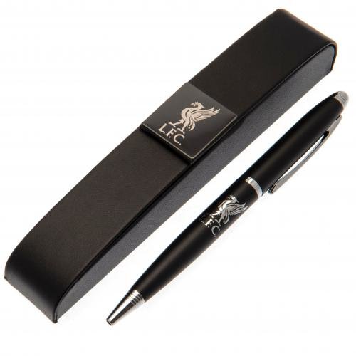 Kovová černá propiska v dárkové krabičce, se stejným motivem a logem fotbalového klubu FC Liverpool.