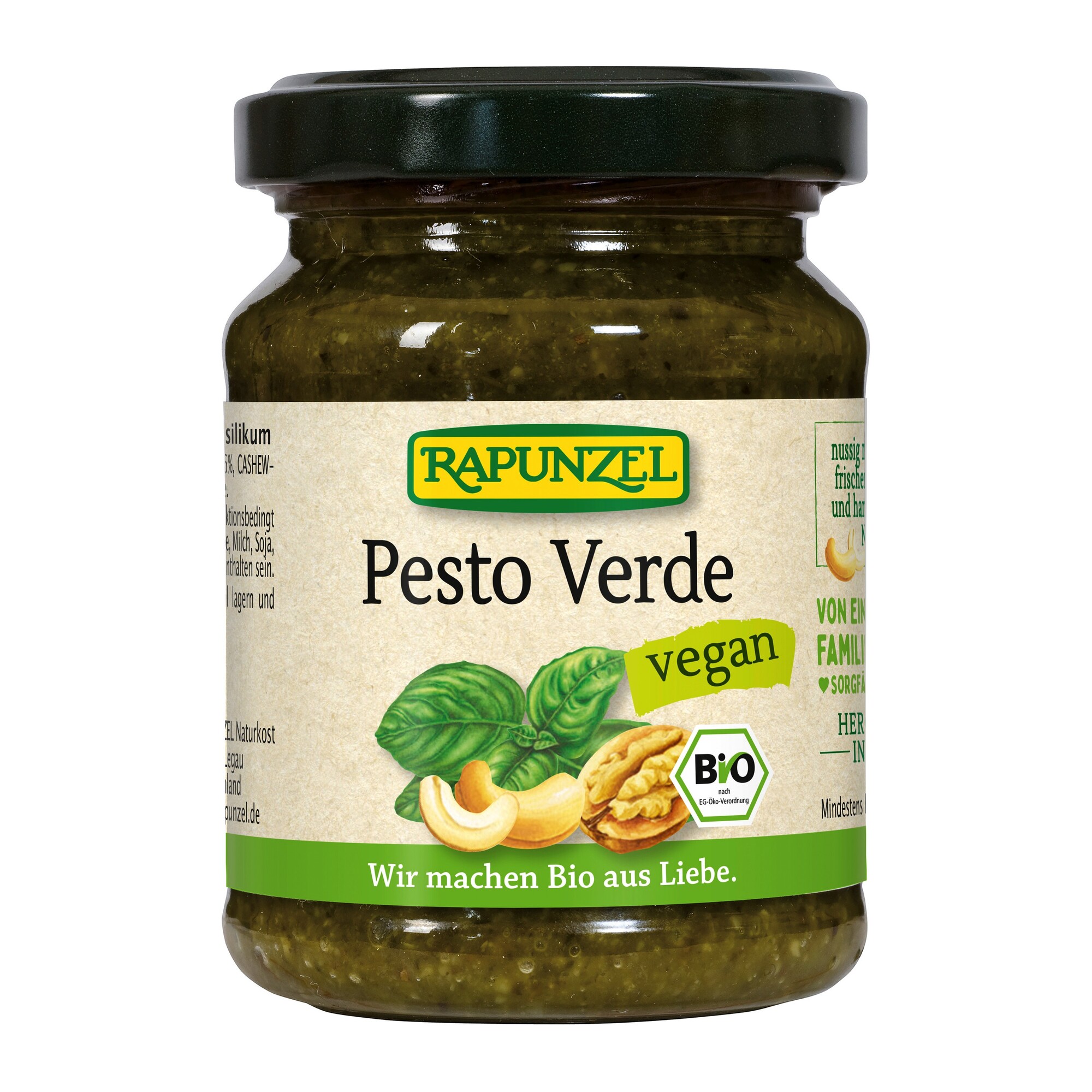 Extra panenský olivový olej, bazalka 26 %, VLAŠSKÉ OŘECHY 16 %, KEŠU OŘECHY 12 %, piniové oříšky, mořská sůl, regulátor kyselosti kyselina citrónová. Pasterováno. produkt kontrolovaného ekologického zemědělstvíKalorická hodnota/energie (na 100ml):2311kJ/560kcal. Tuky: 56 g. z toho nasycené mastné...