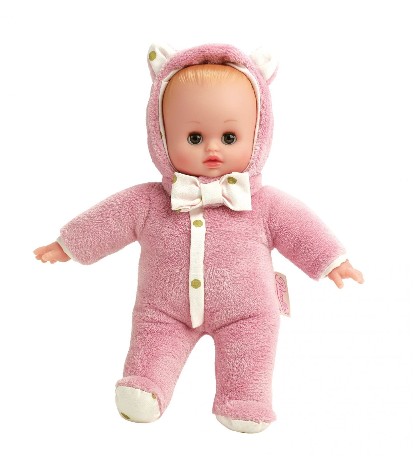 Panenka má měkké látkové tělo, ruce a hlavičku z parfémovaného vinylu, mrkací hnědé oči a blond ručně malované vlasy. Je oblečena do růžového plyšového overálku s mašličkou. Vyrobeno ve Španělsku Francouzská značka Petitcollin byla založena v roce 1860. Tolikrát se vrátila úspěšnými kolekcemi, že...