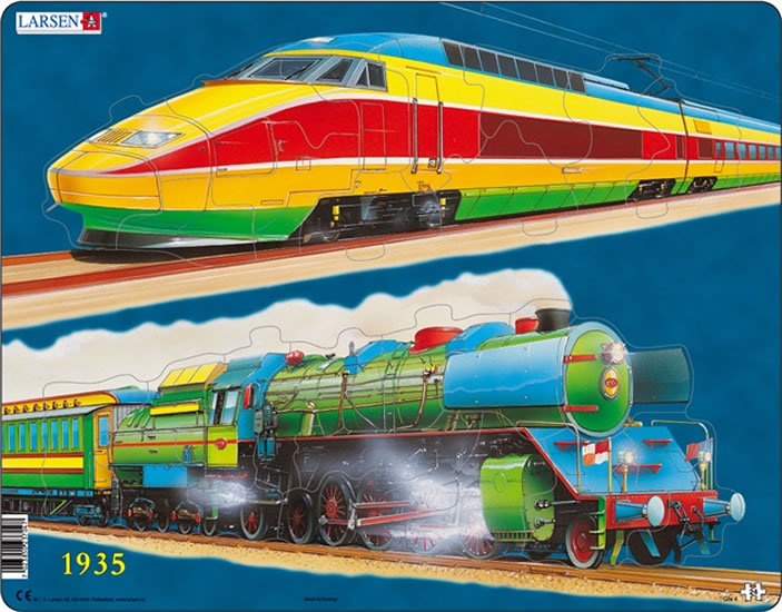 Vlaky včera a dnes. Každý vlak je složen z dílků jako jednotlivé puzzle ve vlastním rámečku. Děti mohou tedy skládat pouze 1 vlak a teprve poté i druhý, což je pro ně snadnější.Později mohou skládat oba obrázky dohromady, což je trochu obtížnější. prečítať celé