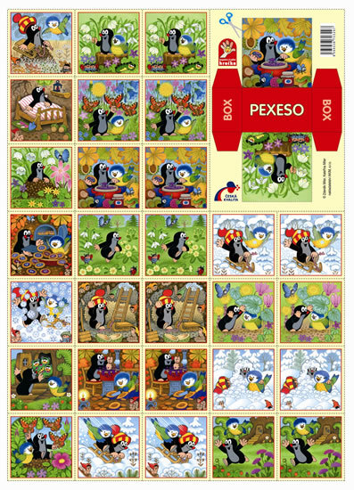 licenční motivy velikost produktu 2 x A4 velikost kartiček 4,1 x 4,1 cm, 32 dvojic + box pro vystřižené kartičky + návod ke hře pevný karton s lesklou povrchovou úpravou proti oděru prečítať celé