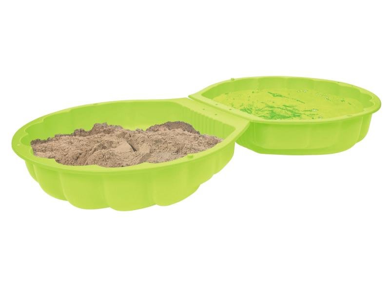 Pískoviště a brouzdaliště v jednom, složené ze 2 dílů s možností uzavření, z velmi kvalitního a pevného plastu. Barva zelená. Kapacita pískoviště 100 litrů. Pro písek cca. 15 - 20 kg na polovinu skořepiny a 40 litrů objem vody pro naplnění do výšky asi 9 cm. Velikost po montáži 180 x 87 x 20 cm. Hmotnost 1,9 kg.