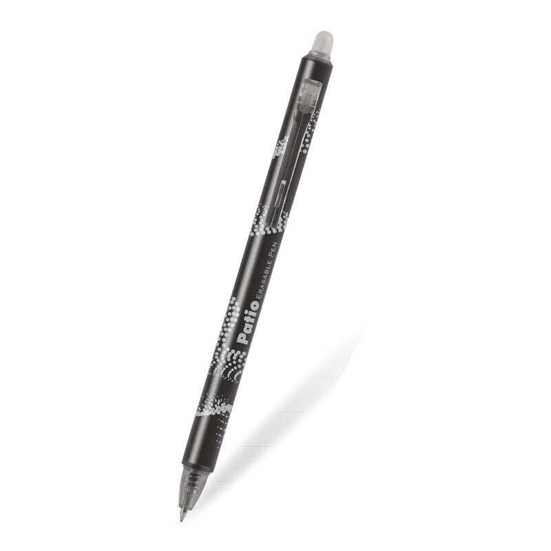 Czarny, wymazywalny długopis od Patio. Posiada boczny automat chowania i otwierania wkładu. Szerokość linii pisania wynosi 0.5mm. Na obudowanie znajduje się wzór, który składa się z kropek. Na szczycie długopis posiada specjalną gumkę (pozwala ona ścierać to, co wcześniej napisaliśmy).Cena za 1 długopis.Wkład: czarnyOpakowanie zbiorcze: pudełkoWymiary opakowania zbiorczego: 6x3x15cm
