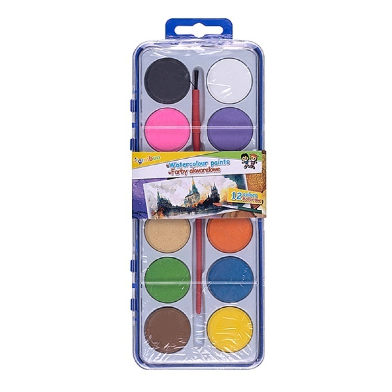 Farby akwarelowe Gimboo, cechy produktu:- średnica pojedynczego koloru 28mm,- plastikowe etui z zamknięciem,- pędzelek w zestawie,- 12 sztuk/12 kolorów,- mix kolorów.Wymiary opakowania: 22x8,5x1,5cmWiek: 3+ prečítať celé