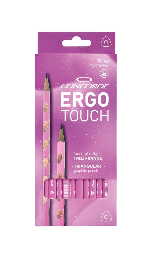 Grafitové tužky ErgoTouch mají ružové provedení a tvrdost c. 2 HB. Jsou urcené pro praváky, mají trojhranný tvar a ergonomický úchop, který zajištuje pohodlné držení pri psaní. Balení obsahuje 12 kusu tužek v papírové krabicce. prečítať celé