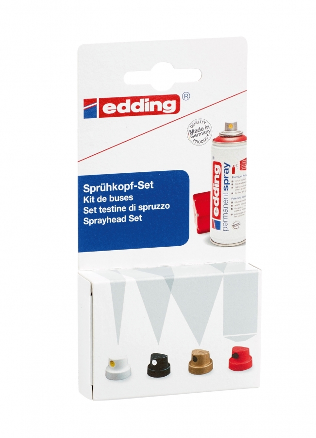 Sada rozprašovačů na akrylové barvy edding 5200 pro malování tenkých linií či velkých ploch. Použití: bílá hlavice pro tenkou stopu 1 cm, černá hlavice pro střední stopu 4–5 cm, zlatá hlavice pro širokou stopu 8–10 cm. Červená hlavice se stopou 13–14 cm je určená pro velké plochy, šířka stopy...