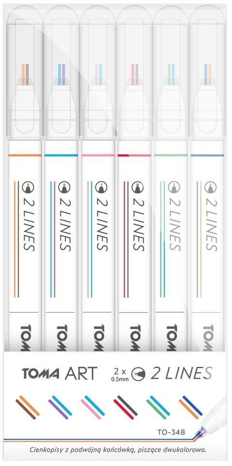 Cienkopisy z 2-kolorową fibrową końcówką 0,5 mm, biała obudowa, niewysychający tusz, ładne i żywe kolory, specjalna końcówka pozwala na pisanie jednocześnie kreską w 2 kolorach tuszu, po obróceniu obudowy można wybrać pisanie jednym kolorem tuszu, tusz cienkopisów jest łatwo spieralny.