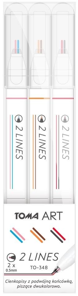 Cienkopisy z 2-kolorową fibrową końcówką 0,5 mm, biała obudowa, niewysychający tusz, ładne i żywe kolory, specjalna końcówka pozwala na pisanie jednocześnie kreską w 2 kolorach tuszu, po obróceniu obudowy można wybrać pisanie jednym kolorem tuszu, tusz cienkopisów jest łatwo spieralny.
