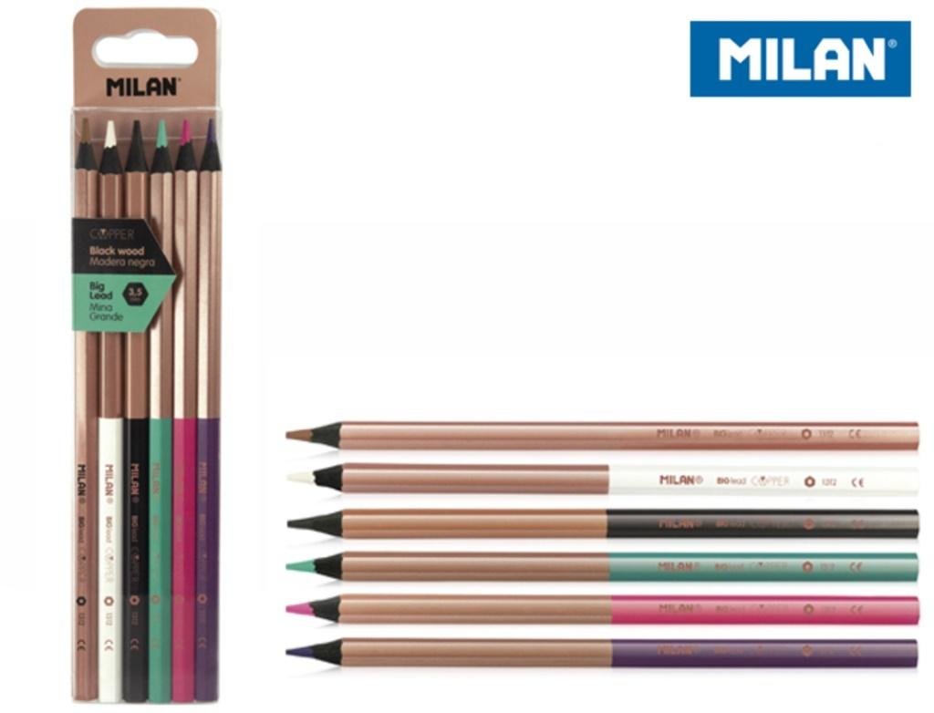 Kredki MILAN sześciokątne z grubym rysikiem o średnicy 3,5 mm z kolekcji Copper. Wykonane z czarnego lipowego drewna. System ochrony rysika LPS zwiększa odporność na złamanie przyklejając go do drewna. Drewno pozyskiwane jest ze zrównoważonych plantacji. 6 kolorów: miedziany, biały, czarny, zielony, różowy i fioletowy.