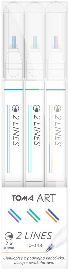 Cienkopisy z 2-kolorową fibrową końcówką 0,5 mm, biała obudowa, niewysychający tusz, ładne i żywe kolory, specjalna końcówka pozwala na pisanie jednocześnie kreską w 2 kolorach tuszu, po obróceniu obudowy można wybrać pisanie jednym kolorem tuszu, tusz cienkopisów jest łatwo spieralny.
