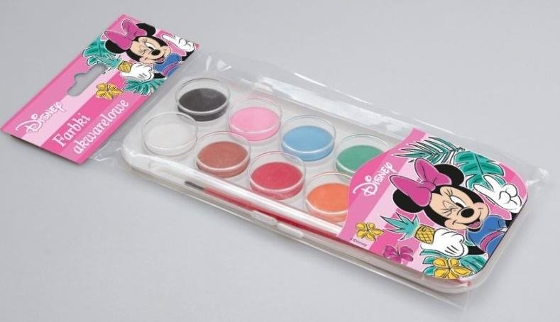 Farbki akwarelowe 12 kolorów. Umieszczone w plastikowym pudełeczku, zawierającym również pędzelek (rączka wykonana z plastiku). Farbki w formie "guziczków" o średnicy 2,8 cm. Pudełeczko łatwo zamykane - typu płaska kasetka, wieczko przezroczyste, podstawa jednolity kolor.