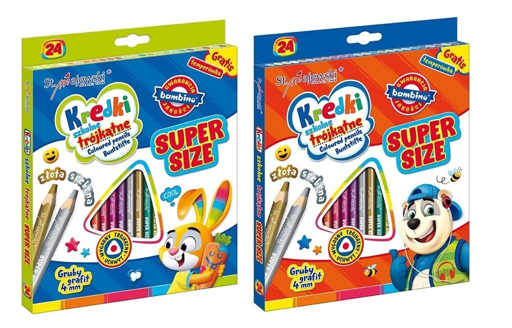 Kredki szkolne trójkątne SUPER SIZE 24 kolory + temperówka. ergonomiczne kredki ołówkowe o trójkątnym przekroju wewnątrz gruby grafit o średnicy 4 mm bogata gama kolorów wysoka jakość wykonania gwarancja jakości Bambino spełniają wymagania zasadnicze dyrektywy Parlamentu...