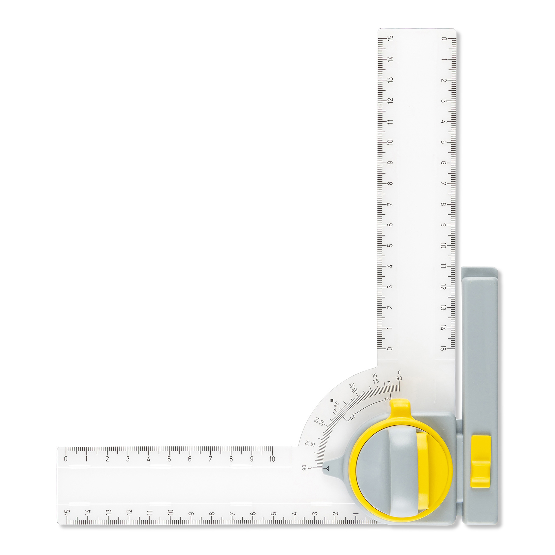 Velká rýsovací hlava ARISTO z průhledného plastu pro úhly mezi 0° a 90°. Délka pravítek je 15 cm a 15 cm. Má blokovací obvod pro pevně nastavitelné úhly po 15° a jemné nastavení pro libovolný úhel. Dorazový mechanismus navíc umožňuje uzamčení na vodící liště.