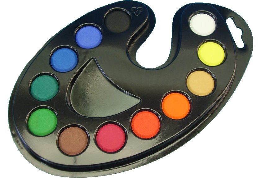 Školní vodové barvy 12ti odstínů s tabletami o průměru 2 cm v barevnících ve tvaru malířské palety. Barvy jsou výrazné, vyznačují se svým vysokým obsahem pigmentů. Jsou certifikované a zcela bezpečné pro děti. prečítať celé