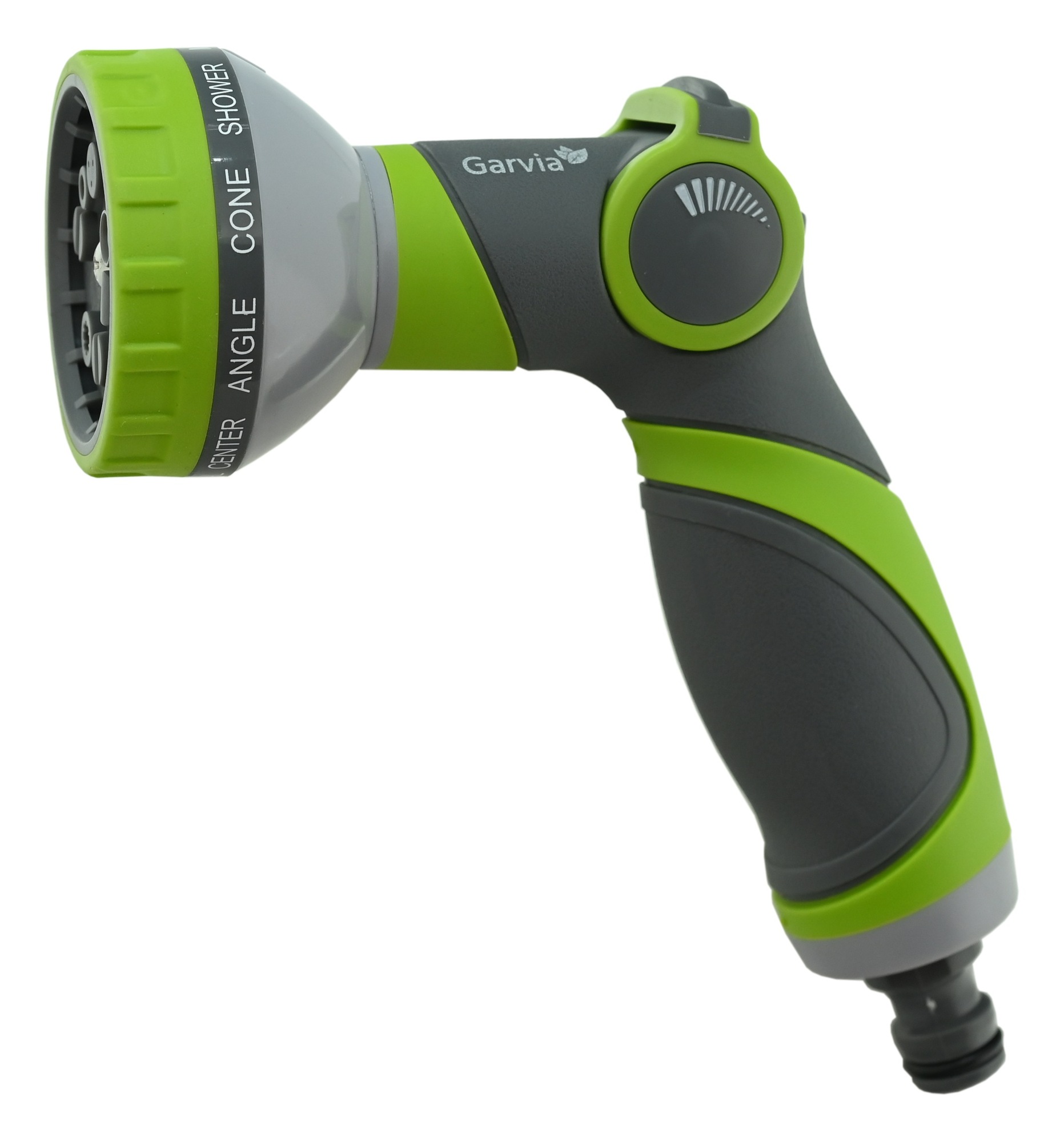 Kruhová zavlažovací pistole s deseti režimy postřiku. Pistole umožňuje výběr z 10 různých typů zavlažování otáčením čelní části (oplach, vertikální postřik, středový postřik, rozstřik pod úhlem, kuželový postřik, sprcha, vodní mlha, silný proud, plochý proud, smáčení). Vrchní část rukojeti je...