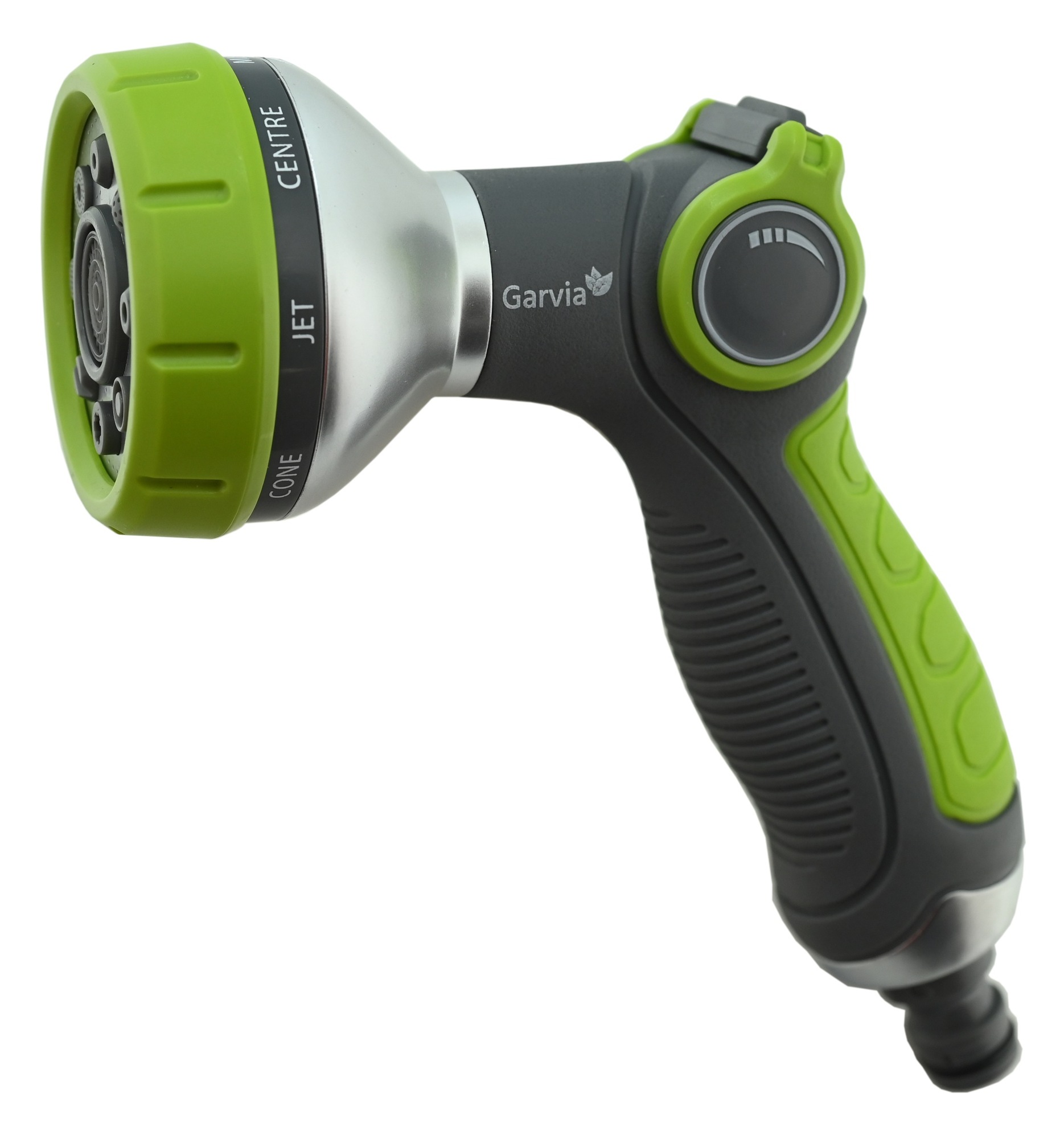 Kruhová zavlažovací pistole s osmi režimy postřiku. Pistole umožňuje výběr z 8 různých typů zavlažování otáčením čelní části (plný oplach, kuželový postřik, silný proud, středový postřik, vodní mlha, sprcha, smáčení, plochý postřik). Vrchní část rukojeti je potom opatřena ovladačem průtoku vody a...