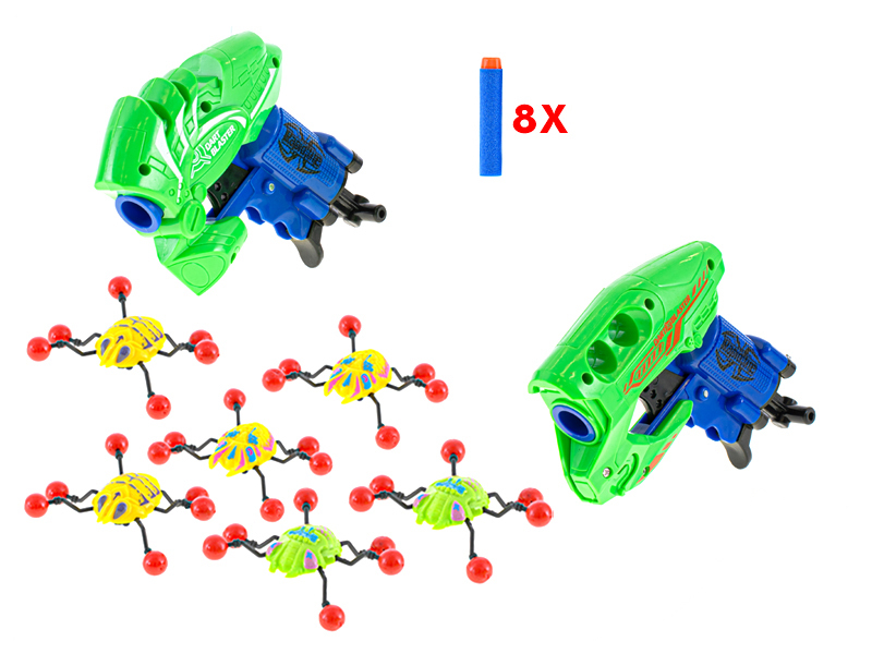 S touto skvělou hračkou si užijete spoustu zábavy. Balení obsahuje 2ks pistolek o velikost 12 cm, které jsou na natažení. Součástí balení je 8ks pěnových nábojů a hmyz jako terč. Podstatou hry je sestřelit, co nejrychleji všechny brouky . Dokážeš je sestřelit dřív než tvůj soupeř?