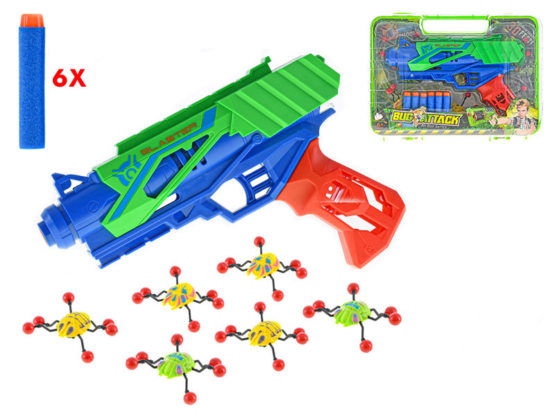 Pistole 24cm na natažení s pěnovými náboji 6ks a hmyzem jako terč v kufříku