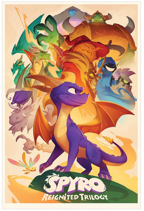 Oficiální plakát z katalogu produktů s logem, fotografiemi a grafikou Spyro.