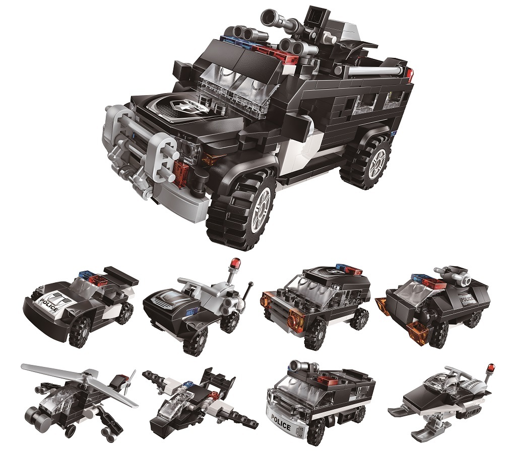 Sada osmi stavebnic s policejní tematikou, z kterých můžete postavit helikoptéru, letadlo, obrněné vozidlo, skútr, aj. Když spojíte všechny stavebnice dohromady, vznikne superobrněné vozidlo. Vyrobeno z netoxického ABS plastu, v balení 198 dílků.