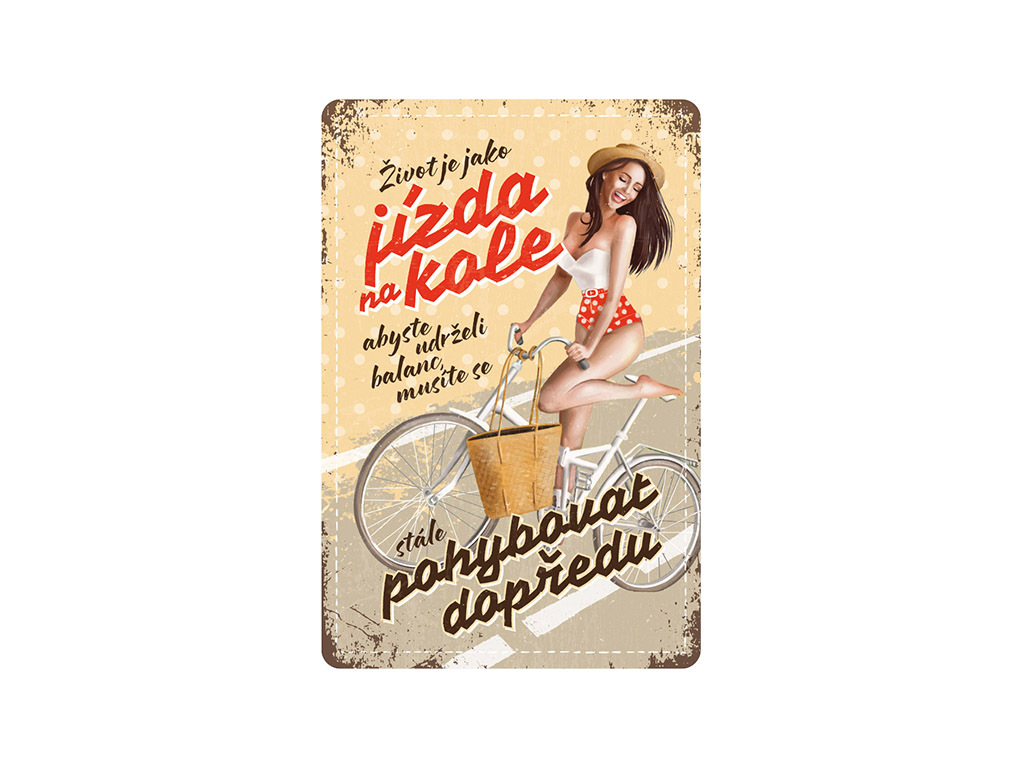 Retro plechová cedulka s textem "Život je jako jízda na kole. Abyste udrželi balanc, musíte se stále pohybovat dopředu.".Rozměr: 20 x 30 x 0,3 cmMateriál: smaltovaný plech prečítať celé