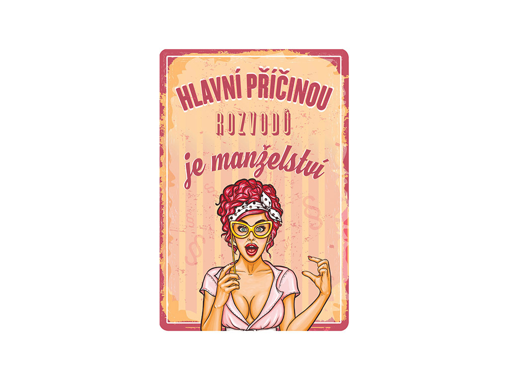 Retro plechová cedulka s textem "Hlavní příčinou rozvodů je manželství".Rozměr: 20 x 30 x 0,3 cmMateriál: smaltovaný plech prečítať celé