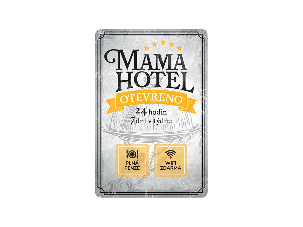 Retro plechová cedulka s textem "Mama hotel".Rozměr: 20 x 30 x 0,3 cmMateriál: smaltovaný plech prečítať celé