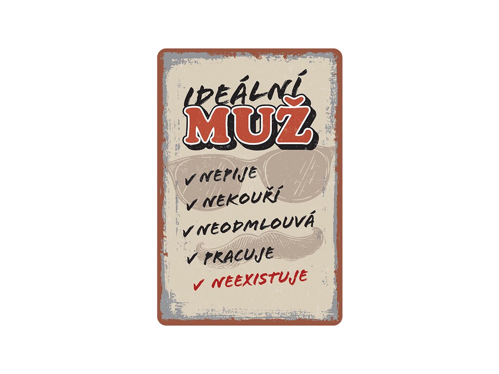 Retro plechová cedulka s textem "Ideální muž...".Rozměr: 20 x 30 x 0,3 cmMateriál: smaltovaný plech prečítať celé