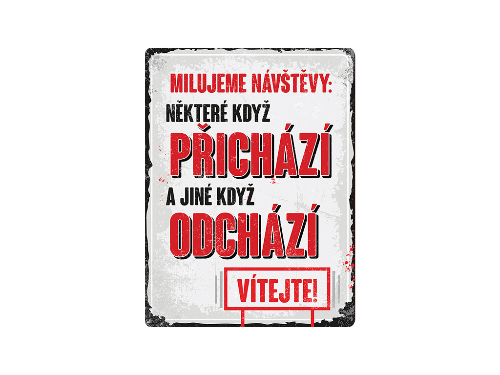 Retro plechová cedulka s textem "Milujeme návštěvy: některé, když přichází a jiné, když odchází. Vítejte!".Rozměr: 30 x 40 x 0,3 cmMateriál: smaltovaný plech prečítať celé