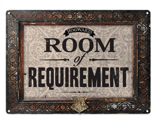 Cedule na zeď s nápisem Room of Requirement z filmové ságy o Harrym Potterovi.