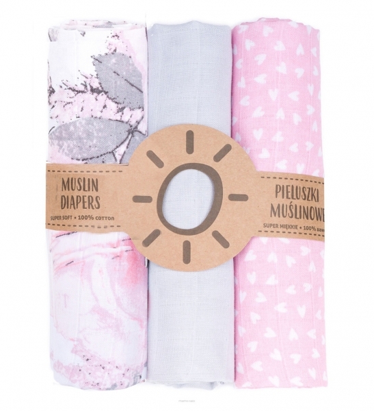 Mušelínové plenky 3ks + žínka zdarma, šedá/růžová - srdíčka, květy