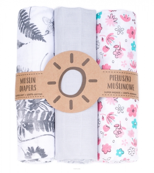 Mušelínové plenky 3ks + žínka zdarma Mamo Tato, šedá, kytičky